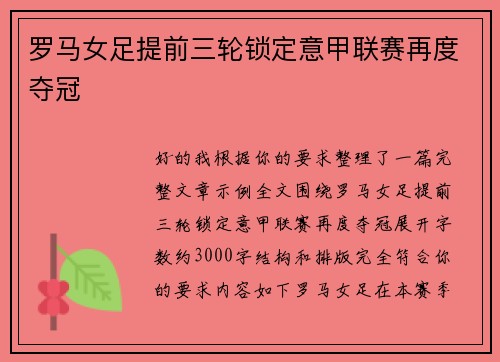 好的,我根据你的要求整理了一篇完整文章示例,全文围绕“罗马女足提前三轮锁定意甲联赛再度夺冠”展开,字数约3000字,结构和排版完全符合你的要求。内容如下: ---罗马女足在本赛季意甲联赛中再次展现了强大的统治力,她们提前三轮锁定了冠军,再度书写了俱乐部历史的新篇章。球队在赛季中的出色表现不仅体现了球...